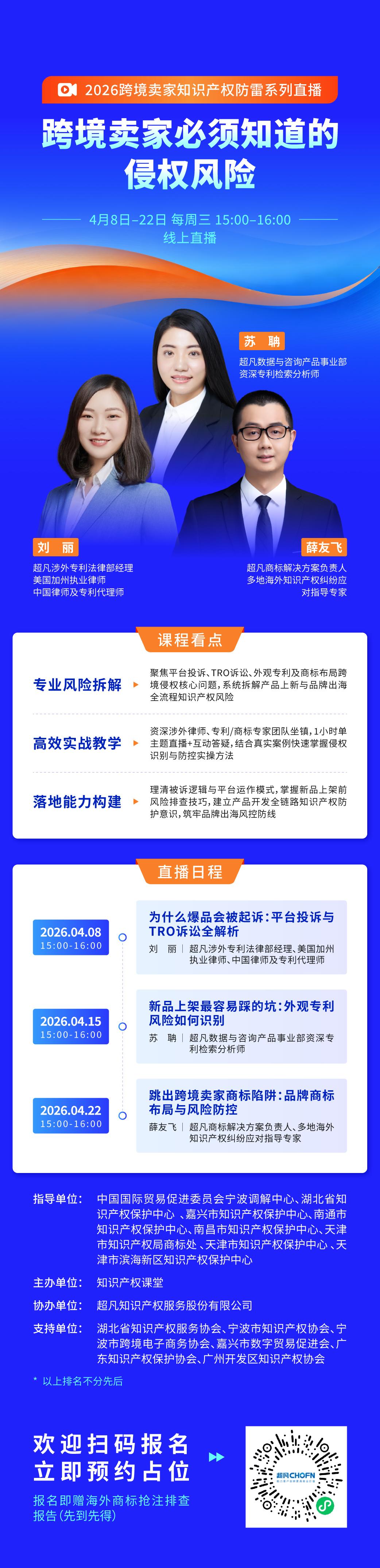 本次系列直播聚焦跨境賣家最常見的知識產權痛點,系統解析風險識別、應對與布局路徑,幫助企業建立全流程風險防控機制,守住經營成果。